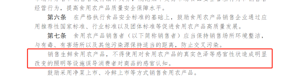 該《辦法》第七條第二款明確規定:銷售生鮮食用農產品,不得使用對食用農產品的真實色澤等感官性狀造成明顯改變的照明等設施誤導消費者對商品的感官認知。否則將面臨最高三萬元的處罰。