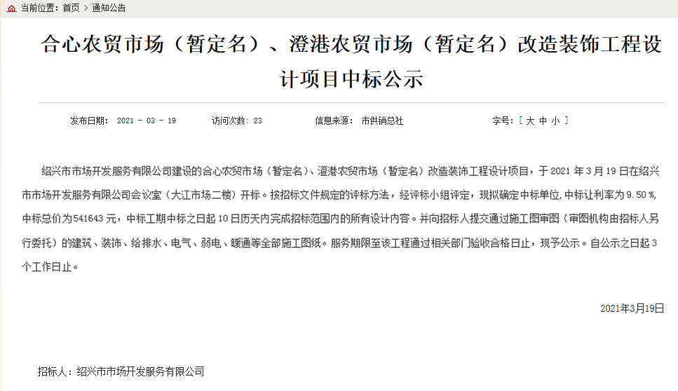 2021年3月19日上午9點30分許,杭州佰映中標合心農貿市場(暫定名)、澄港農貿市場(暫定名)改造裝飾工程設計項目。